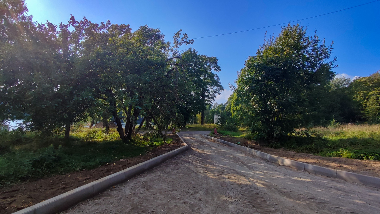 Новый проезд с бордюрами уходит в зелёную зону, пока вместо асфальта только уплотнённый щебень