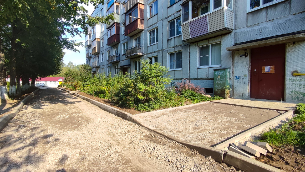 дорога проезд покрытие поверхность дорожные работы город двор благоустройство ремонт придомовая территория дворовой проезд щебень гравий отсыпка бордюр бордюрный камень площадка парковочный карман подъезд панельный дом балконы фасад цоколь граффити кусты клумба деревья аллея тени солнечный день шлагбаум тротуар строительные материалы укладка бордюровПохожие фотографии