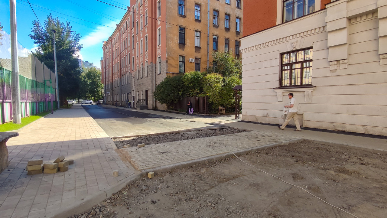 дорога проезд покрытие поверхность дорожные работы город улица тротуар пешеход городская среда спортивная площадка ограждение забор сетка спортивный объект благоустройство ремонт тротуара тротуарная плитка укладка плитки бордюр раскопки грунт фасад здания штукатурка декоративный рельеф архитектурный декор окна уличные фонари провода солнечный день двор инфраструктура пешеходная зона реконструкцияПохожие фотографии
