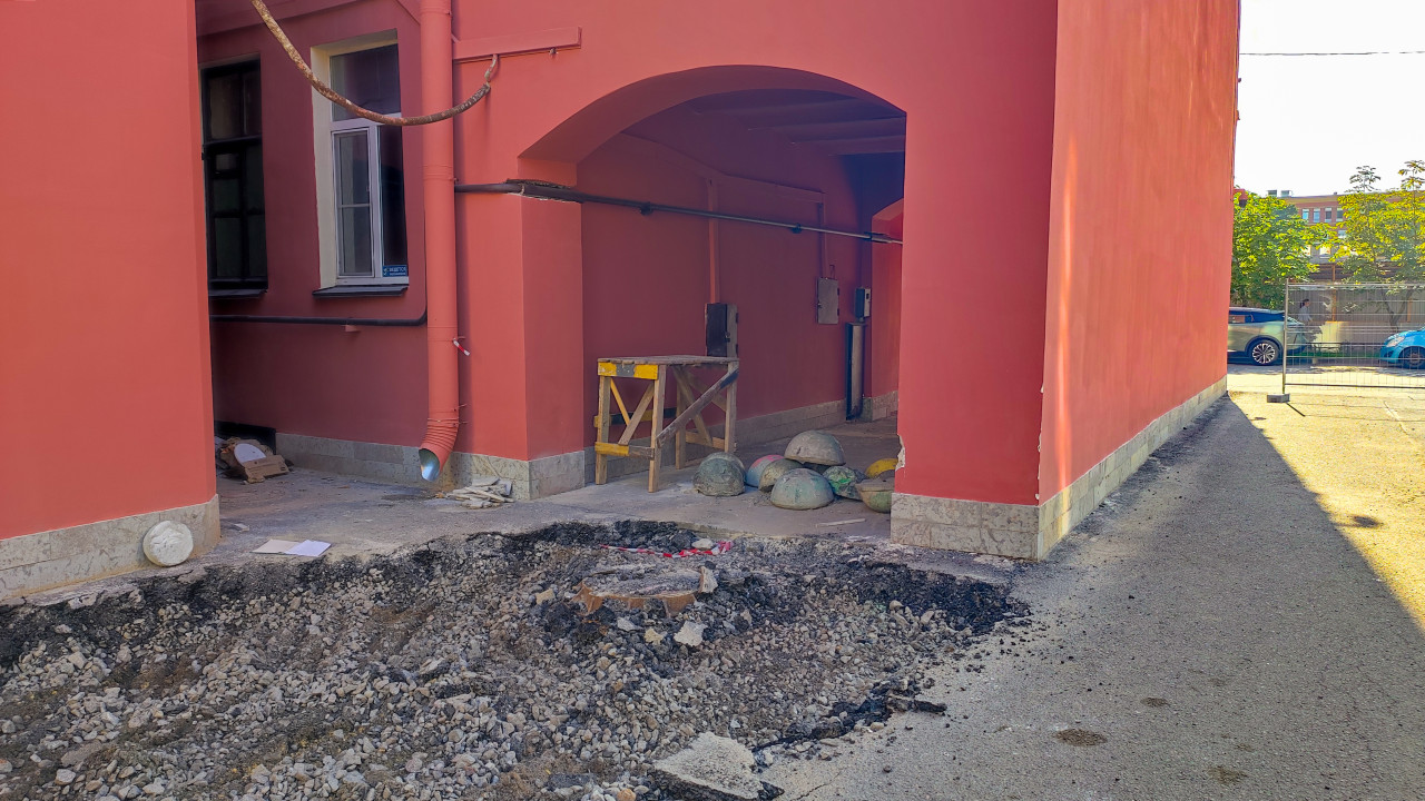 Раскопанный участок под аркой дома с временным ограждением и коммуникациями