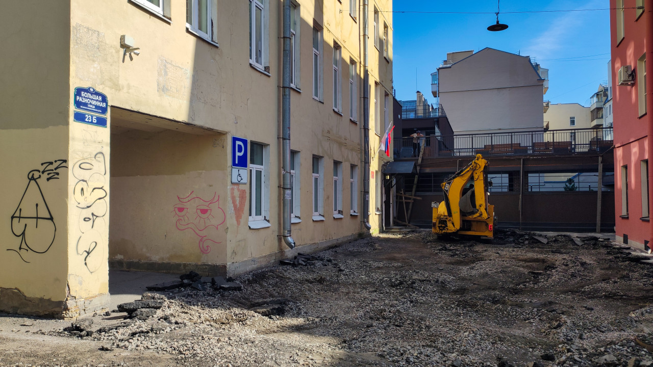 дорога проезд покрытие поверхность дорожные работы строительство коммунальные работы земляные работы мини экскаватор спецтехника ремонт двора разбор асфальта щебень гравий строительный мусор проезд между домами арка жилые дома табличка на стене дорожный знак парковка доступная среда граффити город узкий проезд ремонт покрытия подготовка основания провода уличный светильник солнечный день лето строительная зона благоустройствоПохожие фотографии