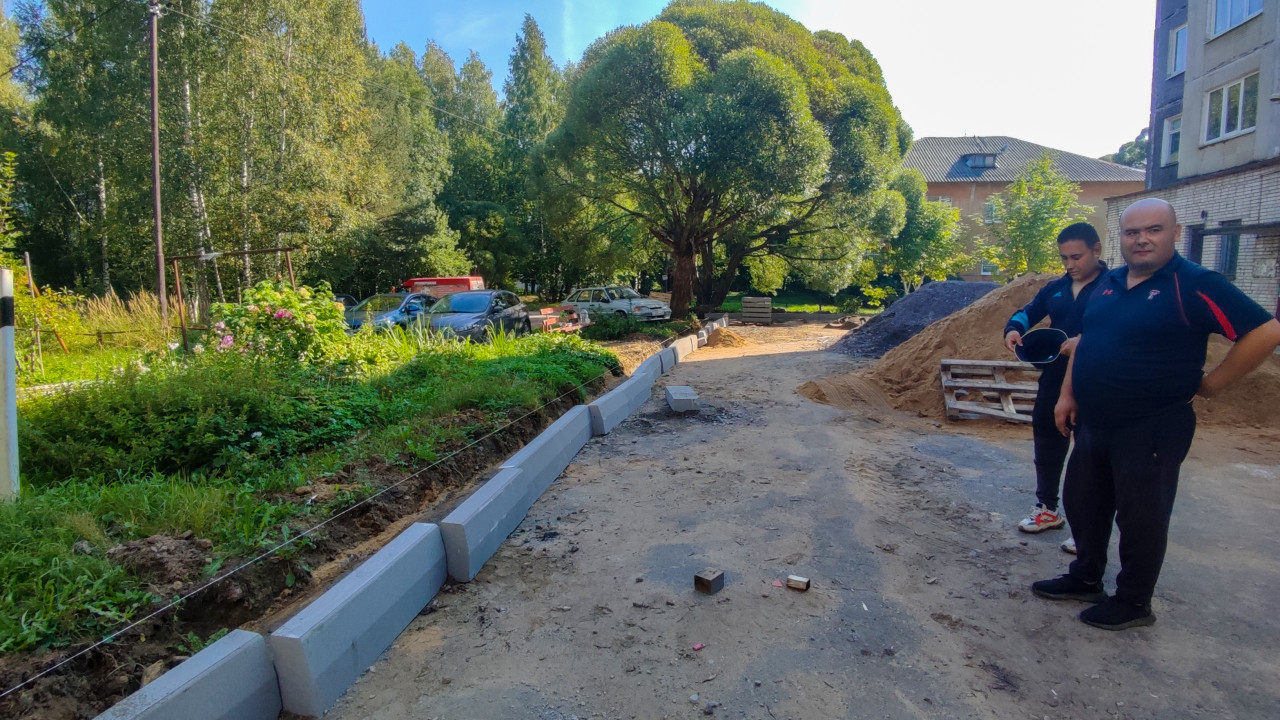 дорога проезд покрытие поверхность дорожные работы благоустройство строительство ремонт двора дворовая территория бордюр бордюрный камень укладка бордюра шнур разметка выравнивание земляные работы грунт песок щебень подсыпка песчано щебёночная смесь стройматериалы поддоны кирпичи инструмент следы техники строительная площадка тротуар озеленение деревья припаркованные машины коммунальные службы технический контроль ремонт территорииПохожие фотографии