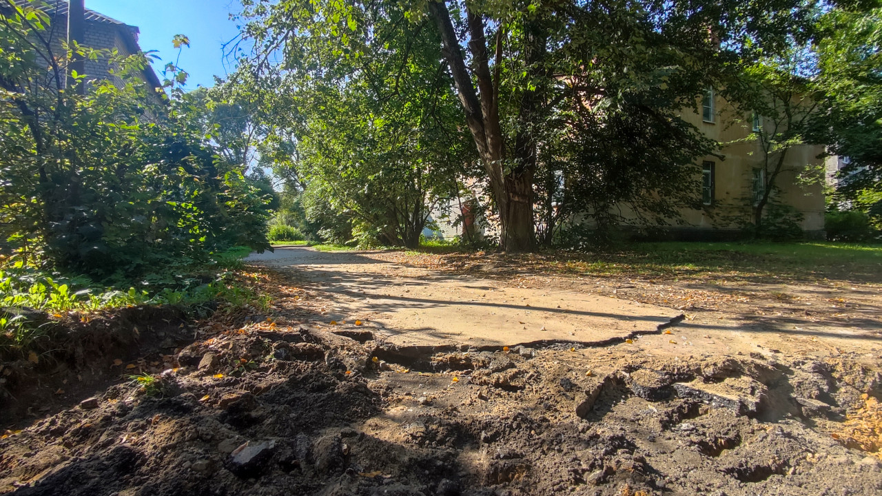 дорога проезд покрытие поверхность дорожные работы двор тротуар пешеходная дорожка бетонные плиты повреждение разрушение дефекты покрытия ремонт благоустройство раскопки грунт песок строительный мусор крошка бетона неровности просадка коммунальные работы городская среда жилой дом многоэтажка деревья кусты придомовая территория ремонт тротуара подготовка основания строительный контроль реконструкция летоПохожие фотографии