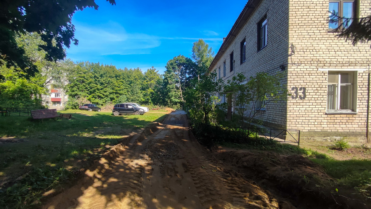 дорога проезд покрытие поверхность дорожные работы город двор грунтовая дорога колеи грязь ремонт снятый асфальт подготовка основания придомовая территория жилой дом многоквартирный дом фасад припаркованные машины автомобили деревья тропинка благоустройство инфраструктура коммунальные работы временная дорога неровности просадка грунта реконструкция двора городской пейзаж летоПохожие фотографии