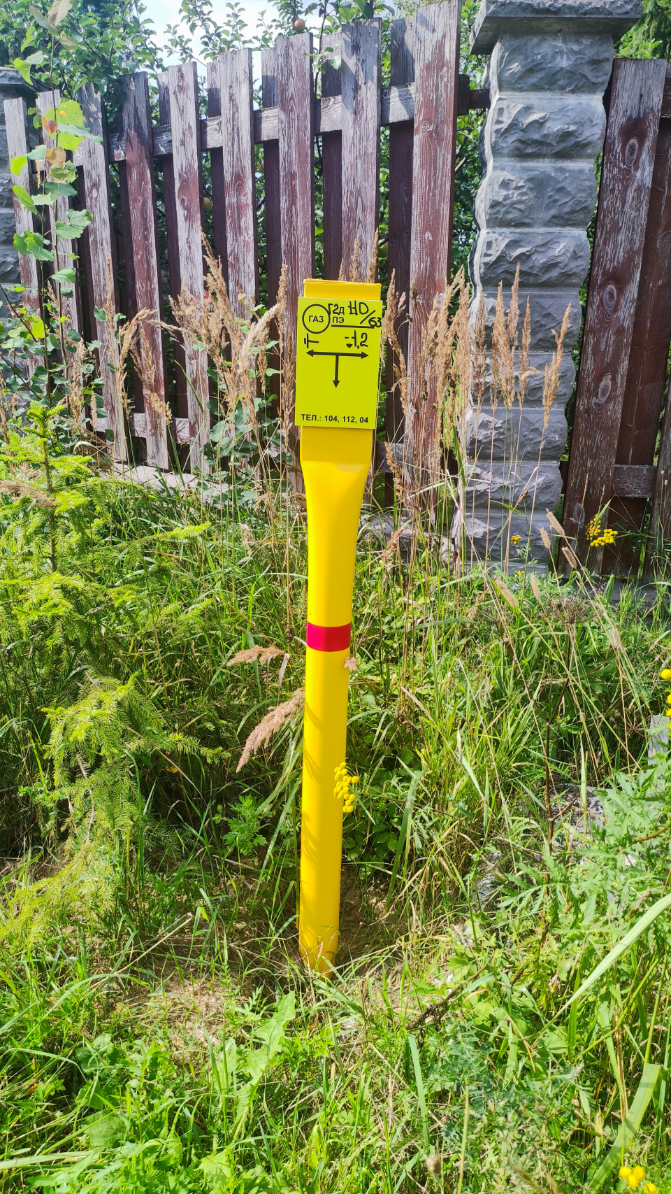 Жёлтый сигнальный столбик газопровода у деревянного забора и каменного столба
