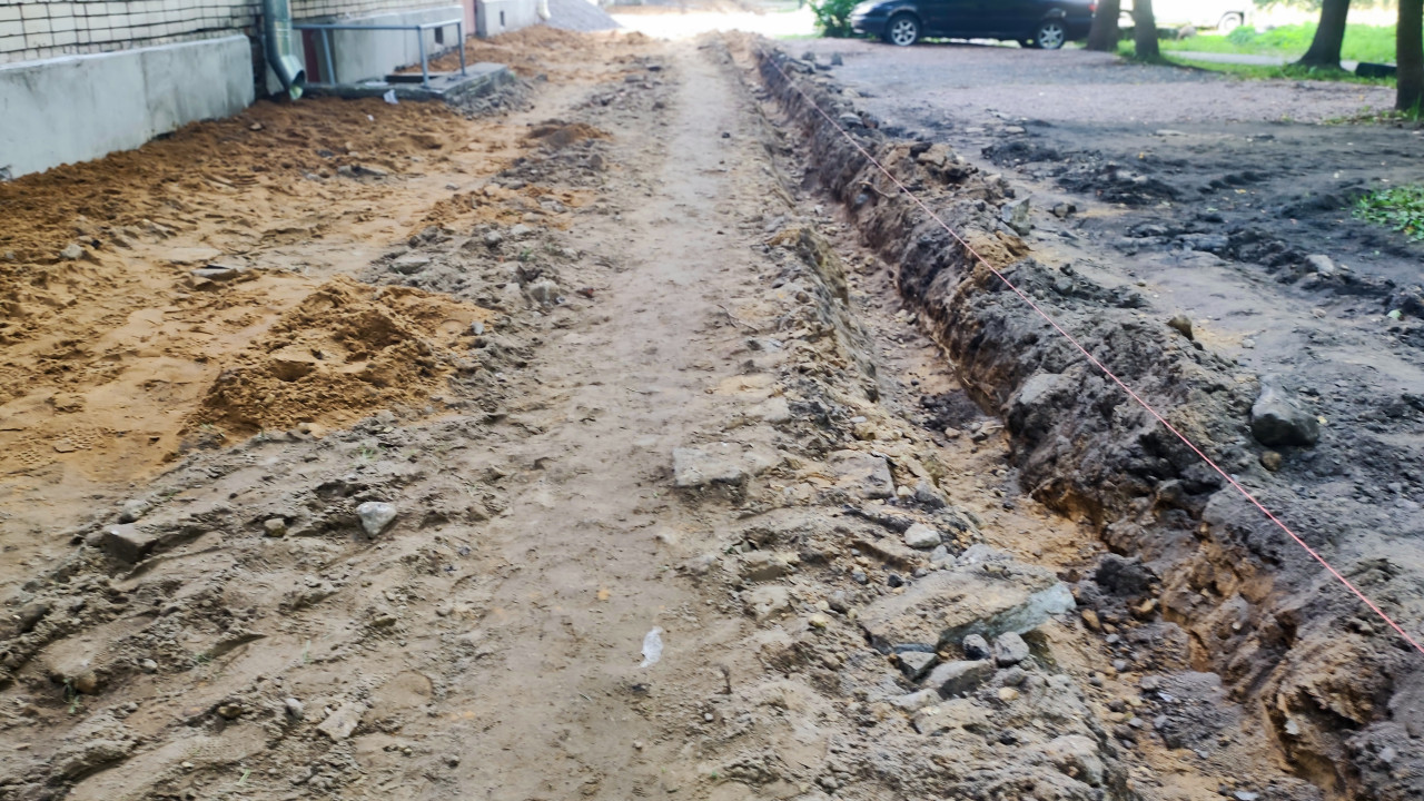 дорога проезд покрытие поверхность дорожные работы город строительство ремонт двор придомовая территория земляные работы траншея разметка шнур шнурка песок щебень подсыпка основание подготовка планировка выравнивание кромка примыкание тротуар фасад дома строительная зона технология работ благоустройство коммунальная инфраструктура лето дневной свет ремонт территорииПохожие фотографии