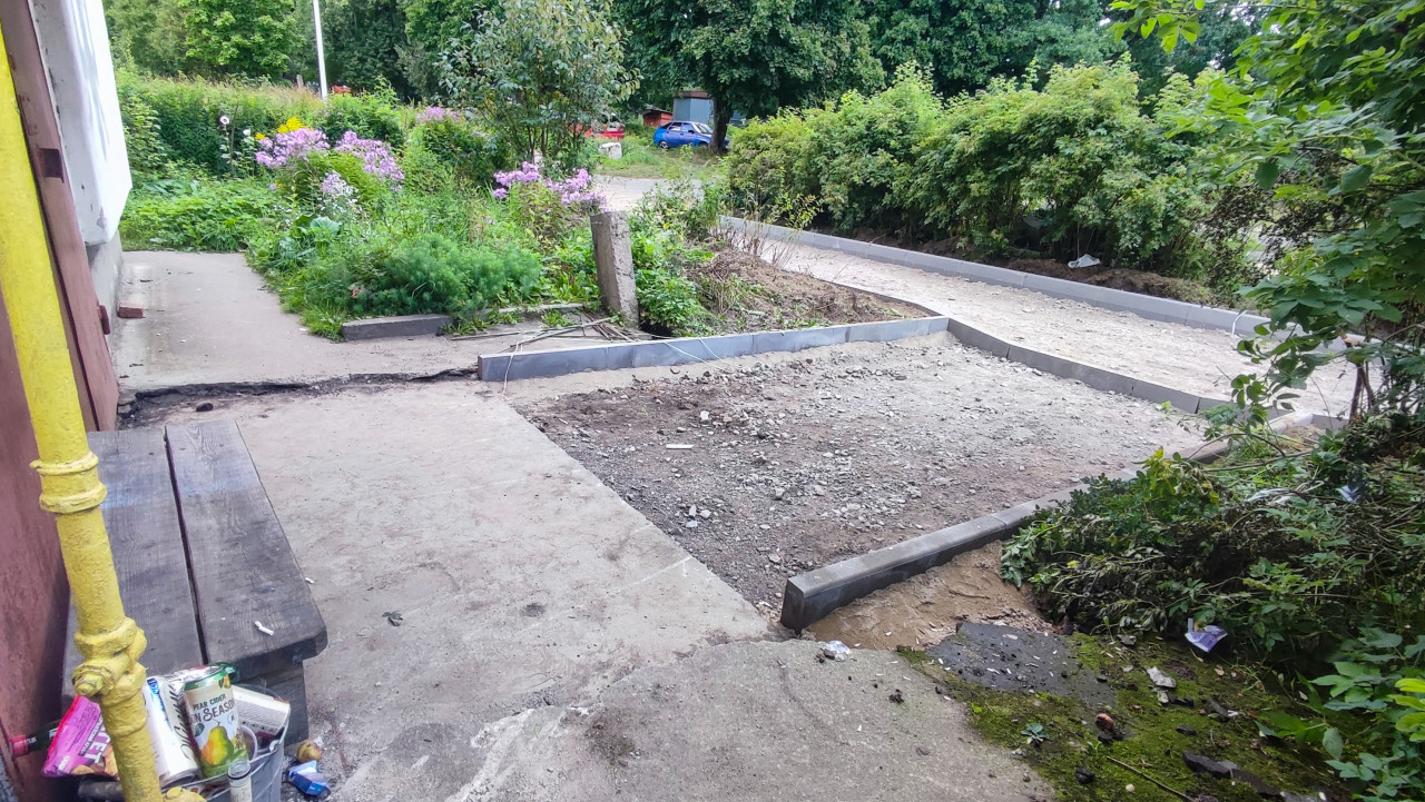 Двор у жилого здания: рядом с фасадом сформирован контур из бетонных бордюров, внутри участка насыпано щебёночное основание с песком и грунтом. В кадре видны элементы дворовой инфраструктуры, включая скамейку, небольшие бетонные плиты и проход вдоль здания; по стене проходят коммуникации и технические детали. На земле заметны следы работ, разрозненный мусор и обломки, у бордюра видна неровная кромка основания. Освещение дневное, без осадков. Фото подходит для тем о благоустройстве, ремонте придомовых территорий и обслуживании городской инфраструктуры.
