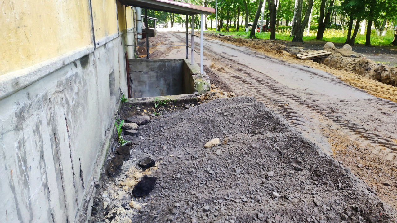 Проезд на ремонте рядом с цокольным входом и насыпью щебня у многоквартирного дома