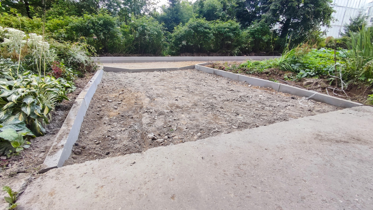 Установленные бордюры и щебёночное основание вдоль дворовой дорожки рядом с клумбой