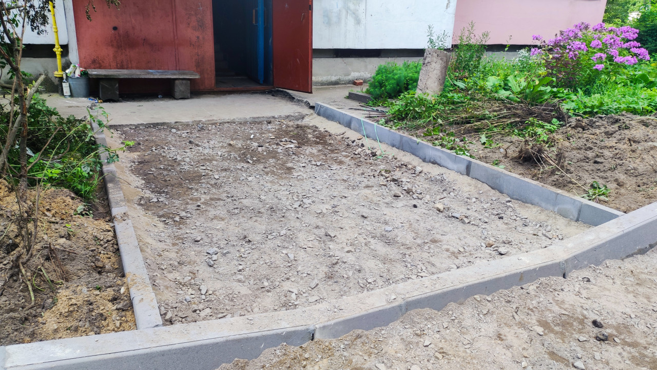 Подготовка основания под покрытие во дворе с щебёночной засыпкой и линией бордюров