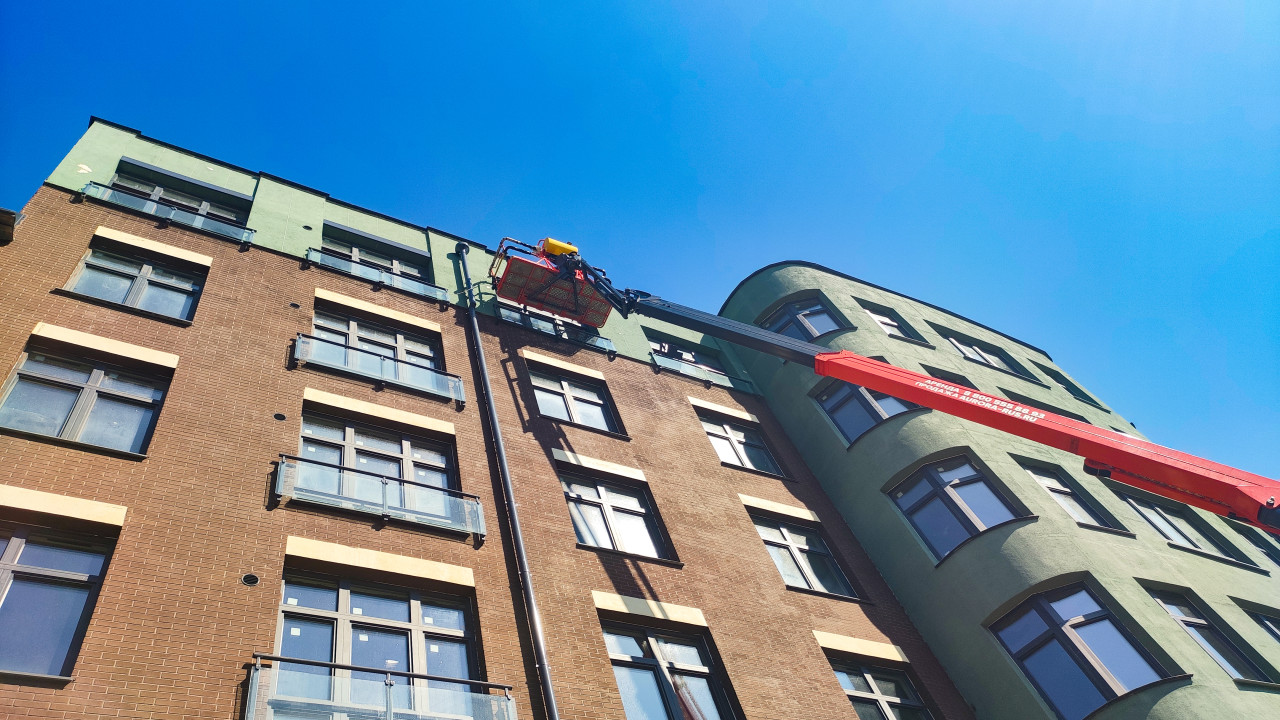 Рабочий в корзине автовышки выполняет фасадные работы у верхней части здания