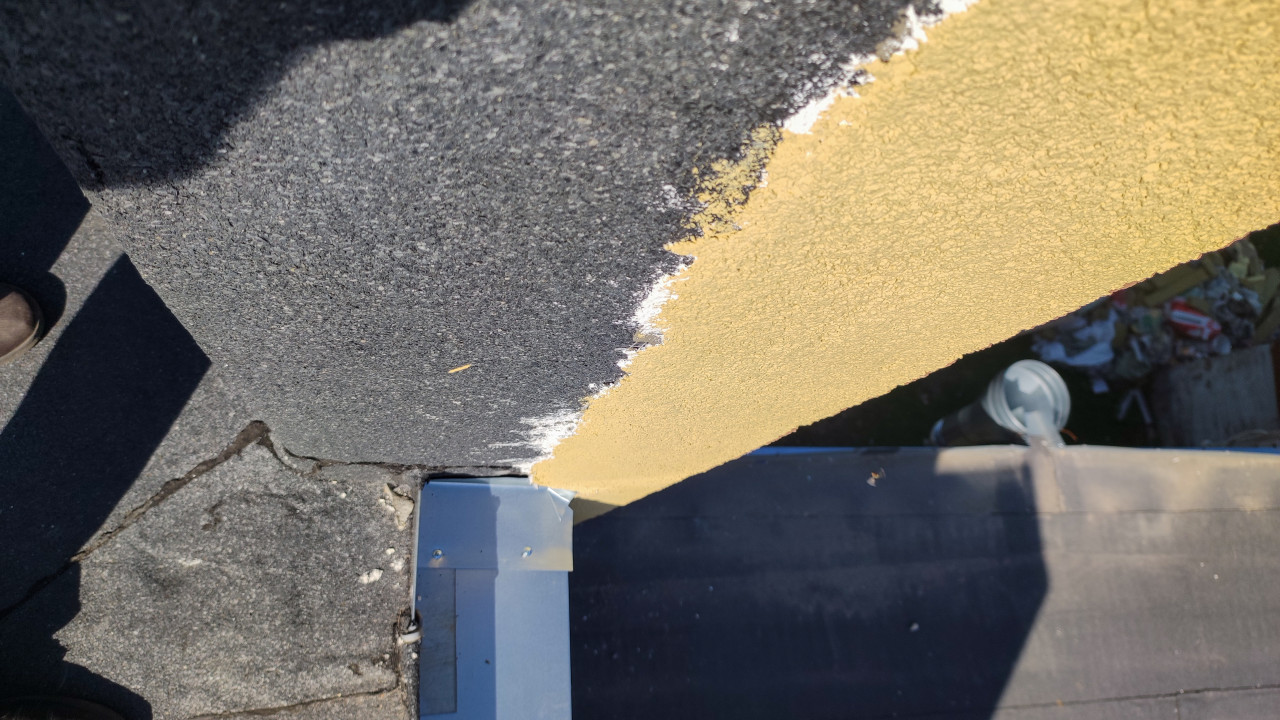 На снимке показан участок плоской кровли у стены: тёмное покрытие с минеральной посыпкой подходит к бежевой штукатурке, а вдоль кромки видна тонкая металлическая планка и линия герметизации. В углу заметны мелкие зазоры, следы подрезки материала и неровности примыкания, рядом лежат мелкие частицы посыпки и строительный мусор. В кадре присутствует край обуви на кровле, что подчёркивает рабочий осмотр узла с близкого расстояния. Фото подходит для материалов о дефектах примыканий, ремонте плоских крыш и техническом обследовании зданий.
