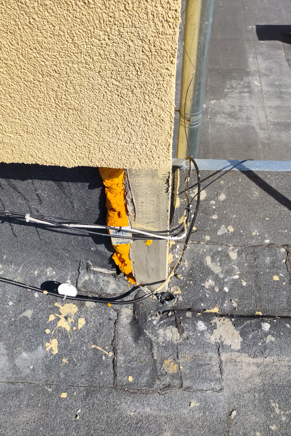 На фото показан участок крыши рядом с водостоком: вертикальная труба и крепления, кабельный ввод, а также соединения и стяжки на проводах. В зоне примыкания видны слои штукатурки, армирующая сетка, монтажная пена и следы герметика, а сверху установлен металлический парапетный колпак. На кровле заметна тёмная посыпка и линия стыка материала, рядом лежат мелкие фрагменты мусора. Кадр подходит для материалов о монтаже слаботочных систем на крыше, водосточных узлах и ремонте кровельных примыканий.