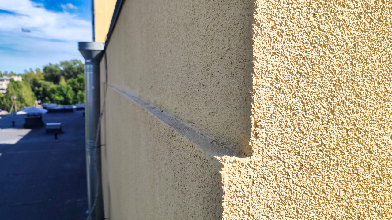 Фасадный угол здания с водосточной трубой и карнизным выступом
