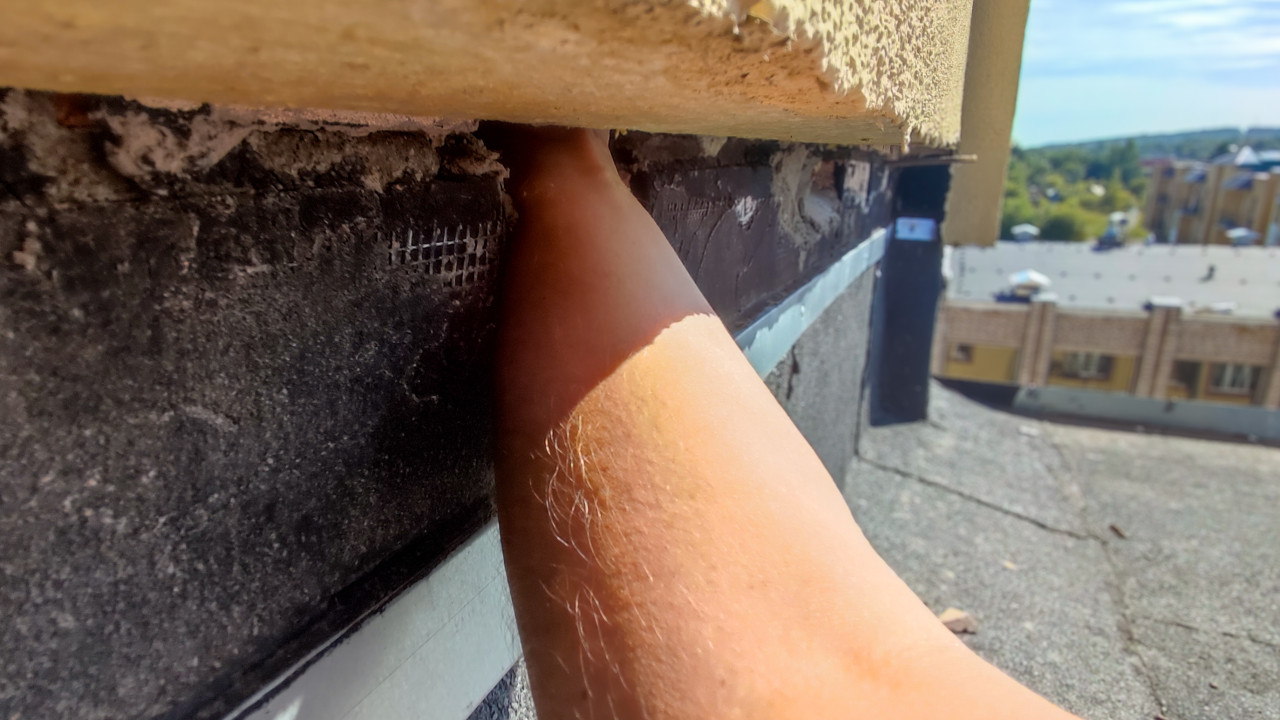 Крупный план на плоской крыше: рука человека просунута под выступающий штукатурный свес у края парапета, где видно многослойное примыкание кровельного ковра. На поверхности лежит чёрная рулонная гидроизоляция, закреплённая металлической прижимной планкой; под штукатуркой заметна армирующая сетка и слой раствора. На заднем плане просматриваются соседние здания, лесополоса и пасмурное небо. Снимок иллюстрирует осмотр узлов кровли и контроль качества ремонта. Подходит для статей о кровельных работах, гидроизоляции и строительной экспертизе.