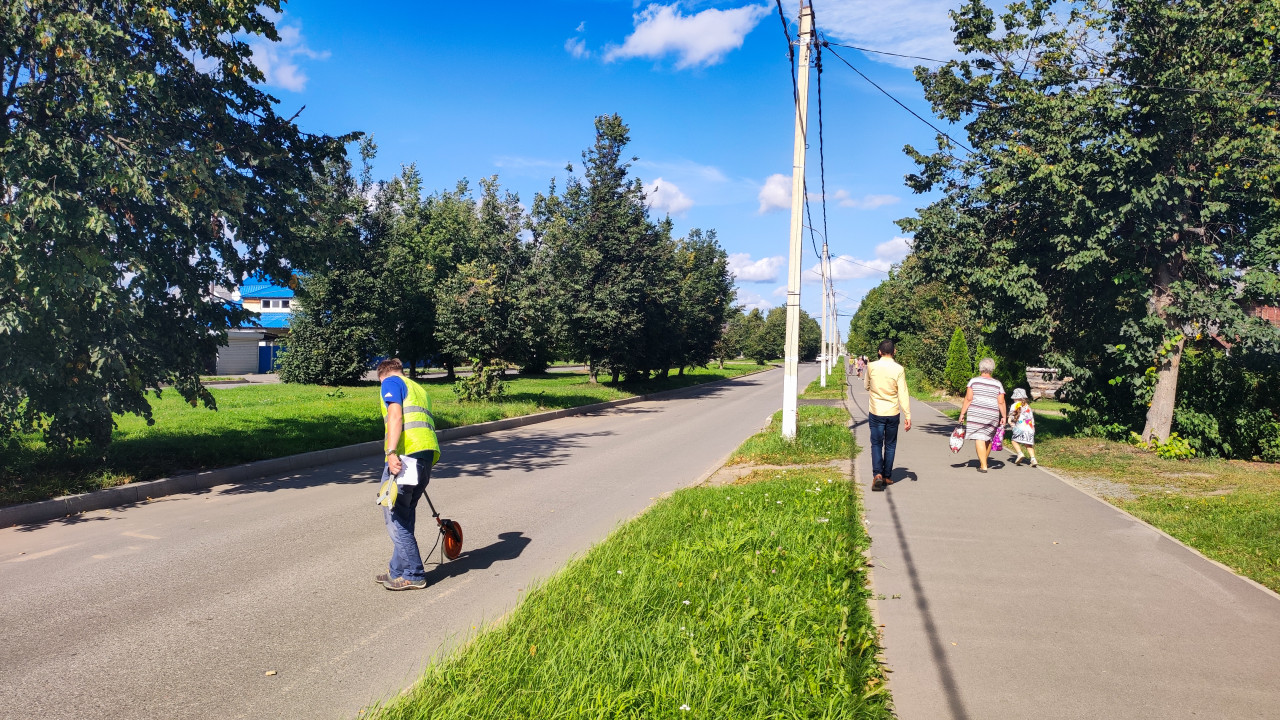город улица дорога асфальт городская инфраструктура строительный контроль технический контроль обследование замеры измерения измерительное колесо курвиметр строительство дорожные работы тротуар пешеходы прохожие ребёнок зелёная зона трава деревья тени уличные фонари опоры провода дорожные знаки рабочий спецодежда сигнальный жилет замер длины контроль состояния дороги благоустройство безопасностьПохожие фотографии