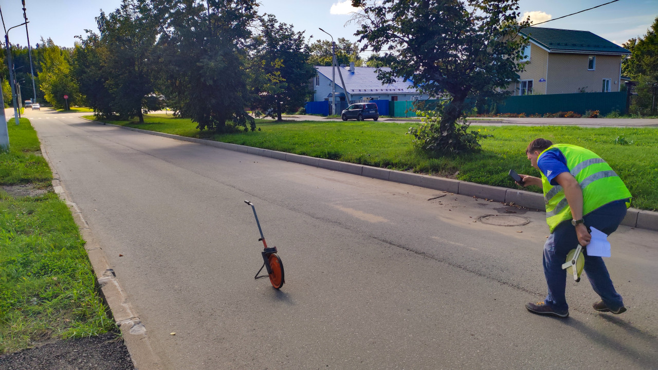 город улица дорога асфальт городская инфраструктура строительный контроль технический контроль обследование замеры измерения измерительное колесо курвиметр строительство дорожные работы контроль качества обследование дороги фиксация дефектов проезжая часть бордюр газон деревья тени рабочий спецодежда сигнальный жилет смартфон фотофиксация замер расстояния документы осмотр покрытия мусор на дороге частный сектор забор припаркованный автомобиль благоустройство ремонтПохожие фотографии