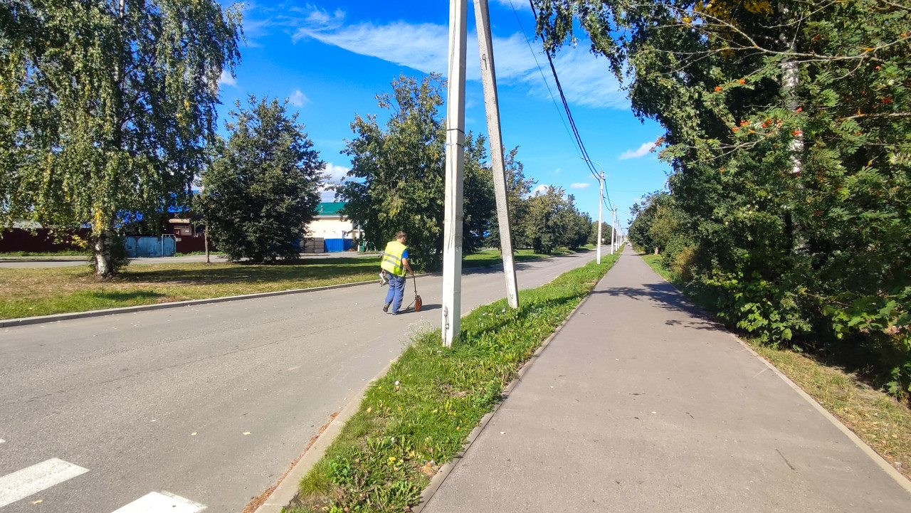 город улица дорога асфальт городская инфраструктура строительный контроль технический контроль обследование замеры измерения измерительное колесо курвиметр тротуар газон зелёная зона деревья рябина тени опоры провода частный сектор городской район рабочий специалист светоотражающий жилет замер расстояния геодезия инвентаризация разметка благоустройство инфраструктура безопасность работ документы инженерные работыПохожие фотографии