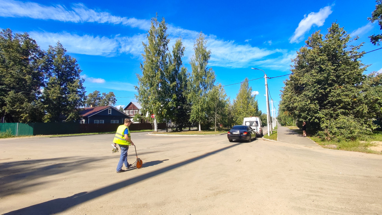Замер проезжей части измерительным колесом на перекрёстке рядом со служебным транспортом