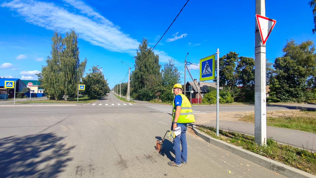 город улица дорога асфальт городская инфраструктура строительный контроль технический контроль обследование замеры измерения измерительное колесо курвиметр перекрёсток пешеходный переход зебра дорожные знаки знак пешеходный переход знак приоритета тротуар бордюр зелёная зона деревья частные дома рабочий инженер каска светоотражающий жилет экипировка техника безопасности замер расстояния геодезия разметка благоустройствоПохожие фотографии