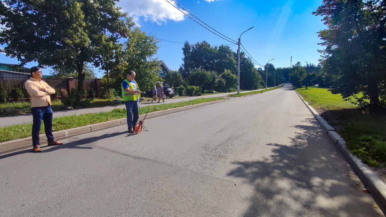 На снимке открытый прямой участок улицы: широкая полоса асфальта почти без движения, бордюры и газоны по краям, справа густые деревья дают тень на покрытии. Слева у кромки дороги стоят двое мужчин, один в сигнальном жилете держит измерительное колесо, второй наблюдает, скрестив руки. На заднем плане видны тротуар, заборы частных домов, несколько прохожих и припаркованные машины. Над дорогой проходят провода, установлены фонари, в небе заметны облака и солнечные лучи. Фото подойдёт для материалов о дорожных замерах, обследовании улиц и безопасности на дороге.