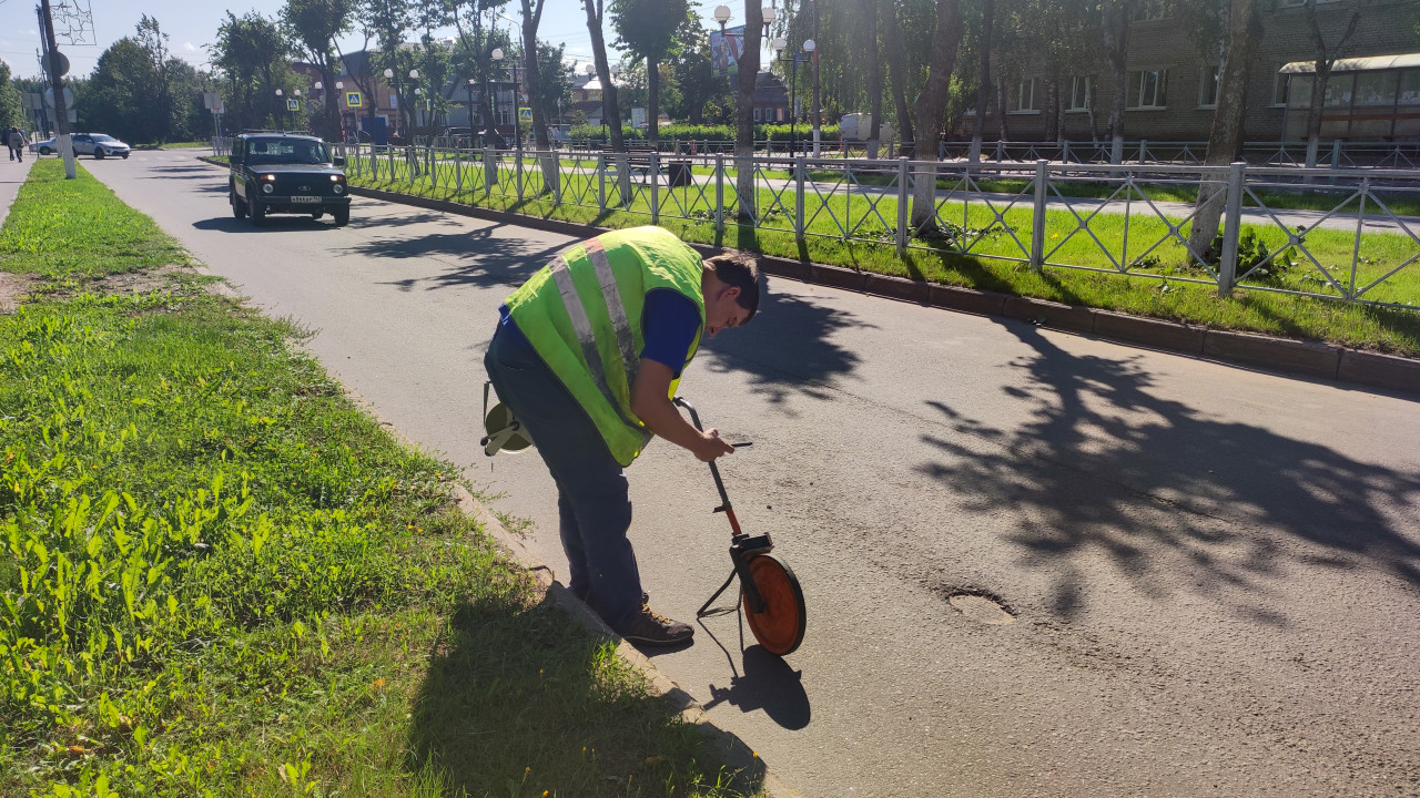 город улица дорога асфальт городская инфраструктура строительный контроль технический контроль обследование замеры измерения измерительное колесо курвиметр дорожное покрытие мерное колесо замер расстояния дорожные замеры инвентаризация обследование дорог контроль качества дорожная инспекция рабочий сигнальный жилет фотофиксация телефон швы заплатки ограждение металлический забор деревья тени солнечный день автомобили безопасность движения дорожные работыПохожие фотографии