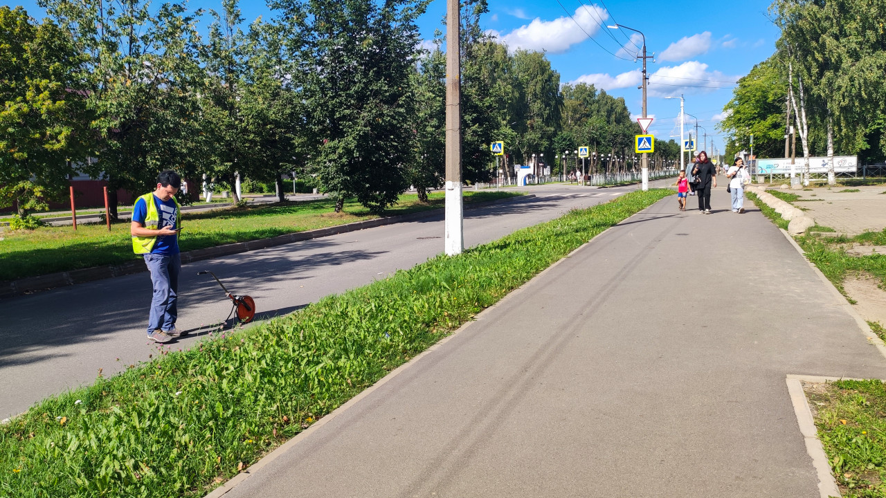 Широкий уличный кадр: справа идёт тротуар, рядом газон и плиточная площадка, слева тянется проезжая часть с бордюром и зелёной разделительной полосой. На дороге стоит мужчина в сигнальном жилете, рядом лежит мерное колесо, в руках у него телефон, будто он фиксирует результаты или согласует работу. Вдали по тротуару идут две женщины и ребёнок, вдоль улицы стоят знаки пешеходного перехода и знак «уступи дорогу», видны фонари, провода и густые деревья. Свет яркий дневной, тени чёткие, на асфальте заметны мелкие неровности. Фото пригодится для тем про городскую инфраструктуру, безопасность движения, коммунальные работы и технический контроль.