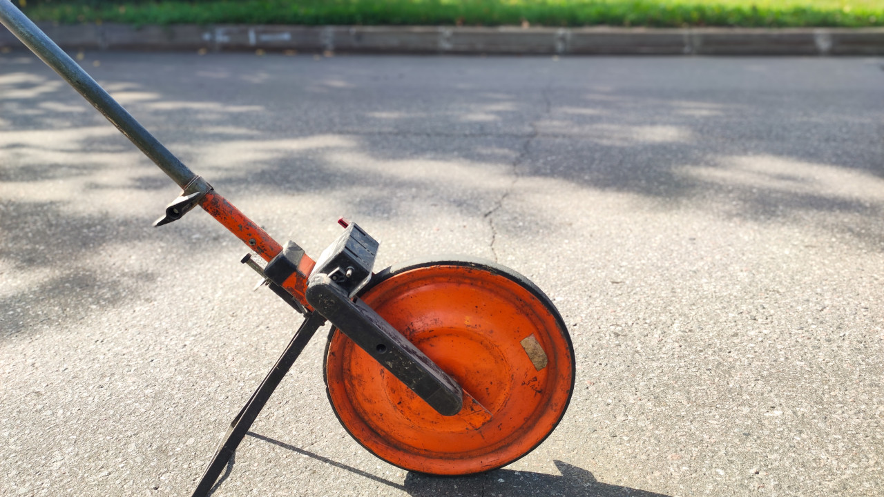 В кадре почти весь акцент на инструменте: оранжевый диск измерительного колеса со следами потёртостей, счётчик, крепёж и упорная стойка, а рукоятка уходит из кадра. Фоном служит гладкий асфальт проезжей части с мягкими тенями, выше видны бордюр и узкая полоска газона. Малая глубина резкости отделяет детали механизма от окружения, поэтому хорошо заметны материал, пыль и следы эксплуатации. Освещение естественное дневное, без бликов от вспышки. Фото подойдёт для тем про замеры на объекте, геодезию, дорожные работы, технический надзор и подготовку сметы.