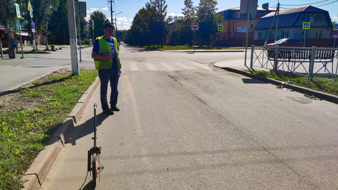 город улица дорога асфальт городская инфраструктура строительный контроль технический контроль обследование замеры измерения измерительное колесо курвиметр бордюр тротуар пешеходный переход зебра дорожные знаки ограждение безопасность ПДД рабочий сигнальный жилет дорожные службы контроль инвентаризация городской транспорт перекрёсток газон трава тени солнечный день инфраструктураПохожие фотографии