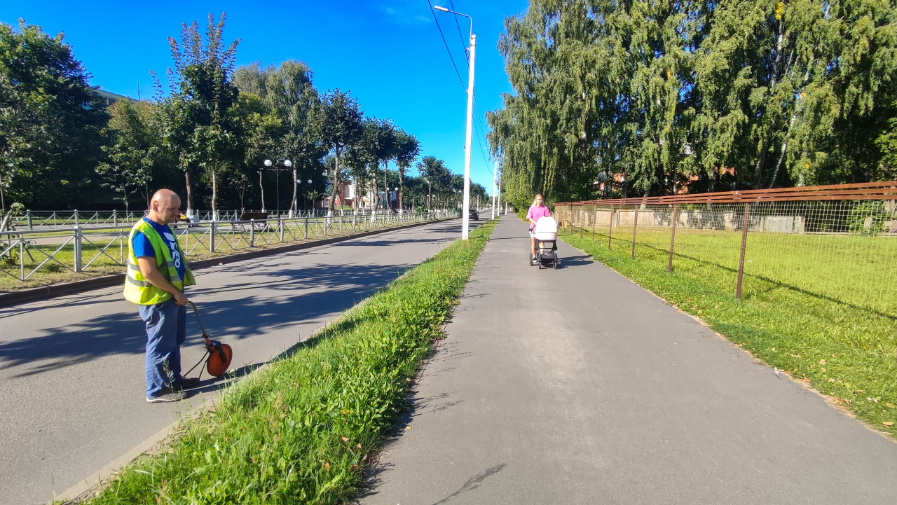 город улица дорога асфальт городская инфраструктура строительный контроль технический контроль обследование замеры измерения измерительное колесо курвиметр дорожные замеры геодезия рабочий сигнальный жилет тротуар бордюр пешеходная дорожка ограждение забор деревья тень солнечный день уличное освещение провода подготовка работ контроль благоустройство пешеходы коляска транспортПохожие фотографии