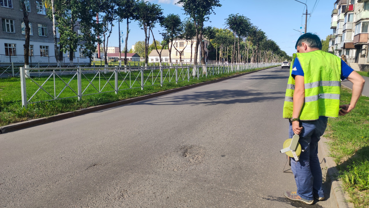город улица дорога асфальт городская инфраструктура строительный контроль технический контроль обследование замеры измерения измерительное колесо курвиметр строительство дорожные работы мерная лента рулетка фотофиксация рабочий дорожник спецодежда сигнальный жилет дефекты покрытия швы заплатки бордюр газон деревья тени дорожные знаки уличные фонари провода ограждение забор припаркованные автомобили контроль качества обследование дорогиПохожие фотографии
