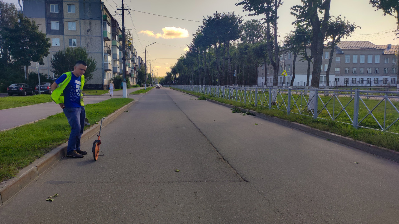 город улица дорога асфальт городская инфраструктура строительный контроль технический контроль обследование замеры измерения измерительное колесо курвиметр дорожное покрытие измерение расстояния мерное колесо рабочий сигнальный жилет контроль качества продольная ровность ровность покрытия дорожная рейка рейка клин промерник неровности ГОСТ Р 56925 2016 дорожные работы благоустройство городская улица тротуар ограждение деревья дневной светПохожие фотографии