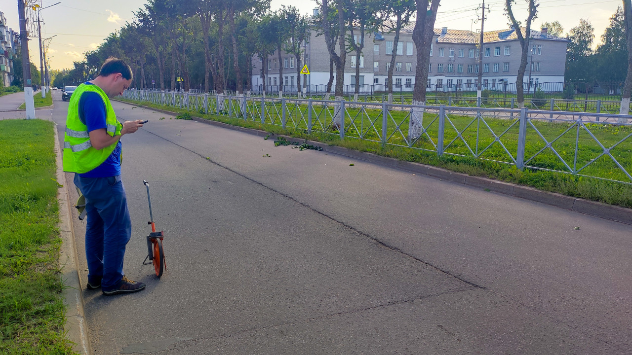 город улица дорога асфальт городская инфраструктура строительный контроль технический контроль обследование замеры измерения измерительное колесо курвиметр строительство дорожные работы замер расстояния дорожник рабочий сигнальный жилет смартфон фотофиксация швы заплатки дефекты покрытия бордюр тротуар газон деревья тени забор жилые дома дорожные знаки пешеходный переход уличные фонари провода подготовка к ремонтуПохожие фотографии