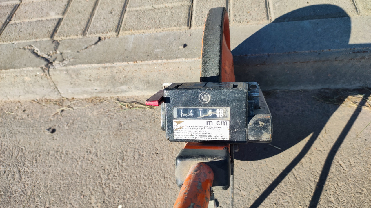 Крупный план измерительного колеса: в центре кадра пластиковый счётчик с механическими цифрами и обозначением «m cm», закреплённый на оранжевой ручке. Видна часть колеса с резиновой шиной, на корпусе следы пыли, от солнца падает длинная тень. На фоне серый асфальт и бордюр, выше лежит тротуарная плитка со сколами и трещинами. Такой прибор используют, когда нужно быстро промерить расстояния на местности и зафиксировать результат в отчёте. Фото подходит для тем про измерительные инструменты, дорожные работы, геодезию и контроль качества.