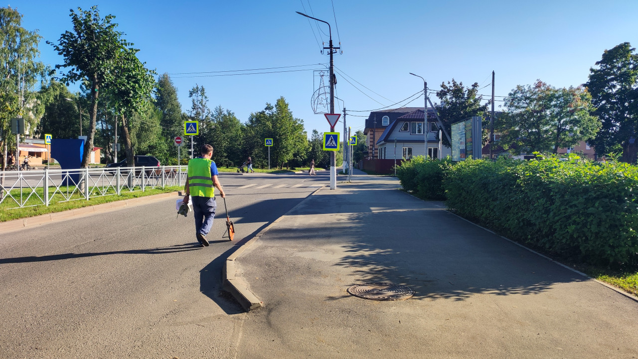 город улица дорога асфальт городская инфраструктура строительный контроль технический контроль обследование замеры измерения измерительное колесо курвиметр строительство геодезия дорожные измерения рабочий сигнальный жилет перекрёсток пешеходный переход зебра знак уступи дорогу дорожные знаки тротуар бордюр ограждение кусты деревья солнечная погода тени подготовка работ благоустройство частные дома провода опорыПохожие фотографии
