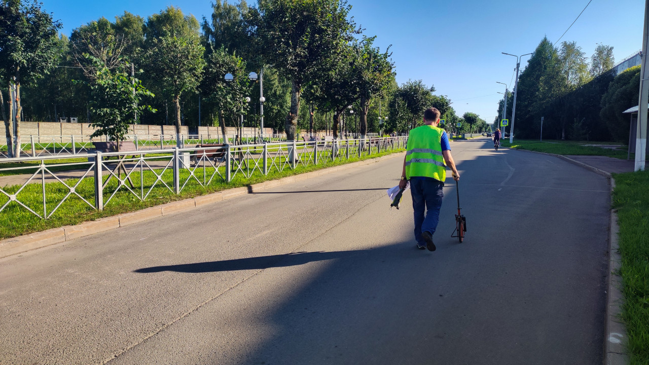 город улица дорога асфальт городская инфраструктура строительный контроль технический контроль обследование замеры измерения измерительное колесо курвиметр ограждение бордюр тротуар газон деревья аллея уличные фонари кусты перспектива рабочий сигнальный жилет дорожные измерения замер расстояния обследование дороги инвентаризация технадзор контроль качества полевые работы пешеходный переход дорожный знак солнечный день теньПохожие фотографии