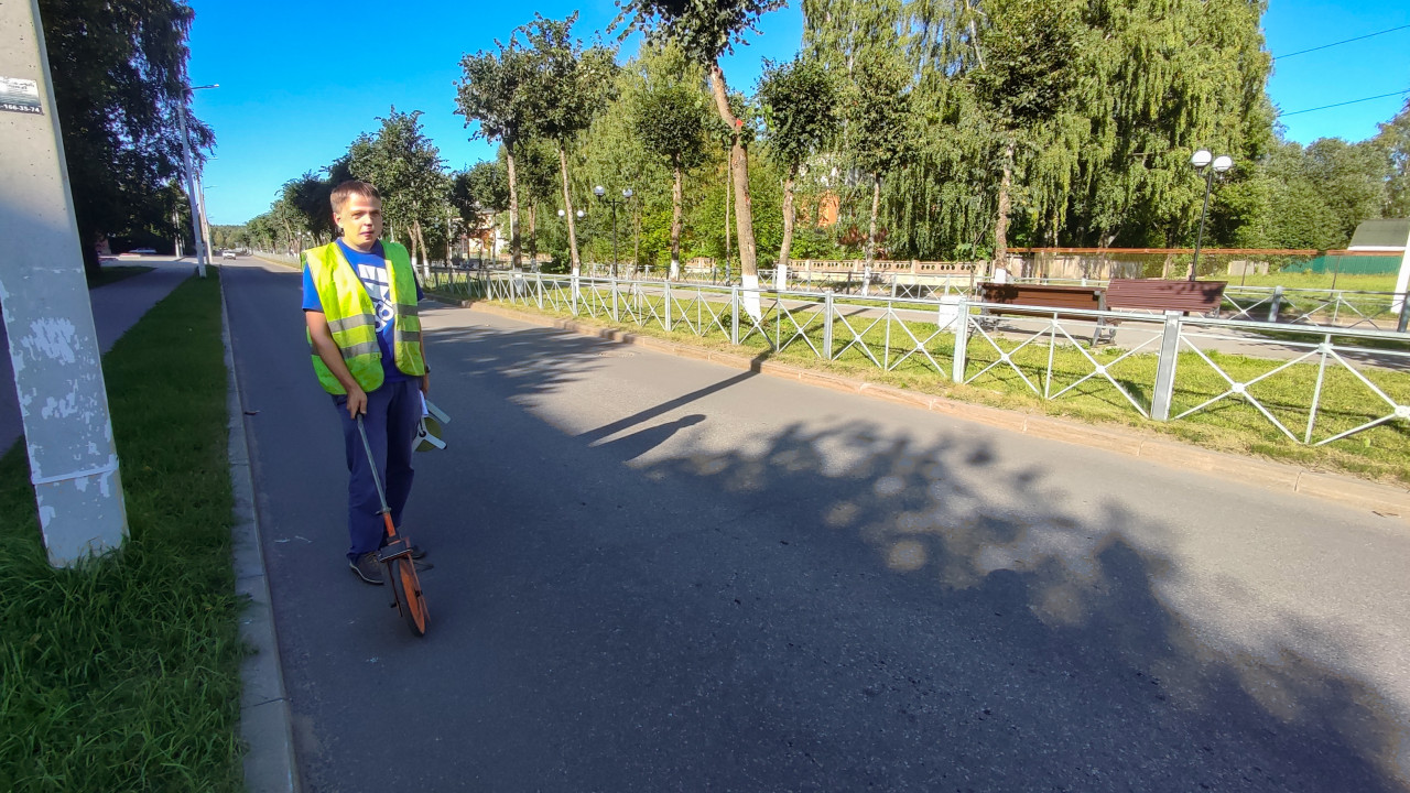город улица дорога асфальт городская инфраструктура строительный контроль технический контроль обследование замеры измерения измерительное колесо курвиметр проезжая часть тротуар газон парк аллея лавочки ограждение деревья зелёная зона тени специалист рабочий дорожный инженер светоотражающий жилет замер геодезия дорожные измерения колесный меритель инвентаризация планирование работ благоустройствоПохожие фотографии
