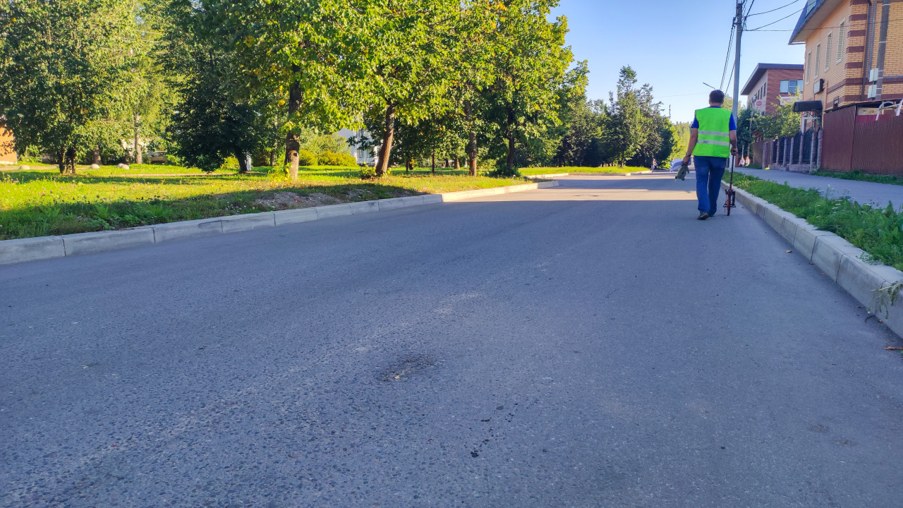 город улица дорога асфальт городская инфраструктура строительный контроль технический контроль обследование замеры измерения измерительное колесо курвиметр строительство геодезия измерение расстояния дорожные замеры рабочий сигнальный жилет новая дорога бордюр тротуар городская улица благоустройство контроль качества подготовка работ зелёная зона парк деревья газон частные дома забор провода опоры солнечная погода тени спокойная улица ремонт дорогиПохожие фотографии