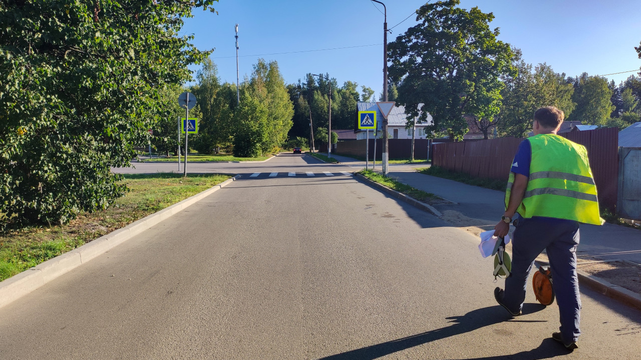 город улица дорога асфальт городская инфраструктура строительный контроль технический контроль обследование замеры измерения измерительное колесо курвиметр строительство геодезия измерение замер расстояния мерное колесо выездной замер специалист сигнальный жилет пешеходный переход зебра знак перехода дорожные знаки разметка безопасность организация движения тротуар обочина забор деревья уличные фонари инфраструктура контроль подготовка работПохожие фотографии