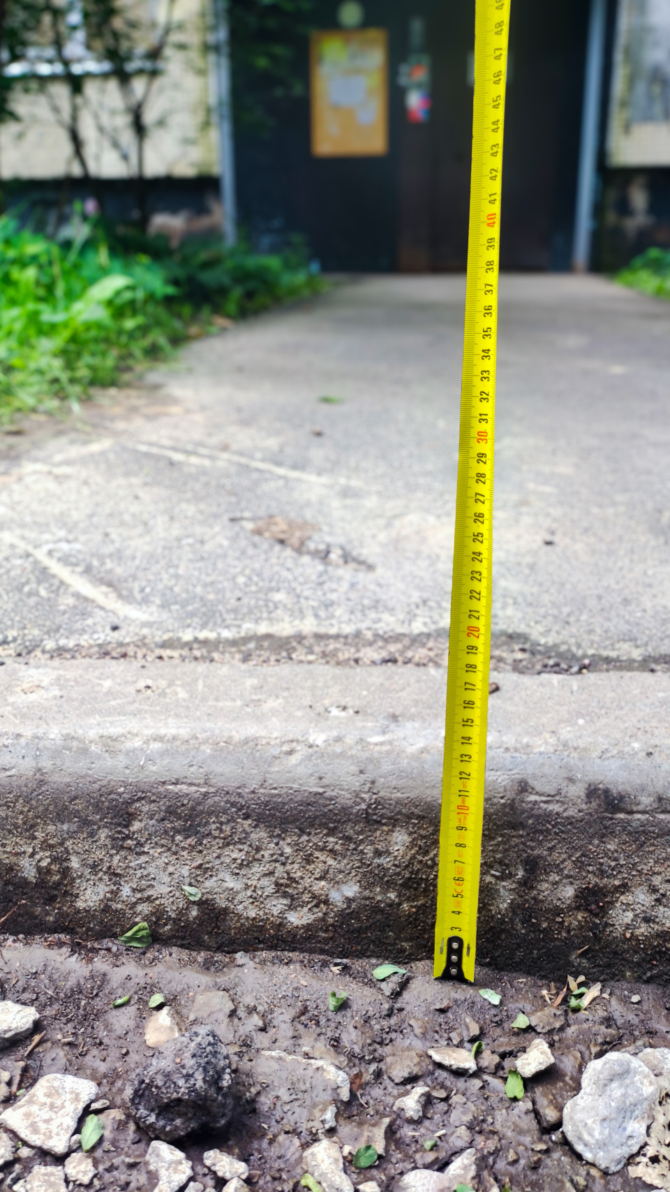 Вертикальный кадр сделан у входа в жилой дом: жёлтая рулетка установлена у бордюра, измеряя перепад между проезжей частью и тротуаром перед подъездом. На переднем плане видны мокрый грунт, щебень и небольшие листья, на бордюрном камне заметны тёмные следы и загрязнения. На заднем плане размыта входная группа с дверью и стендом объявлений, по бокам растёт трава и кусты. Съёмка выполнена на улице при обследовании доступности и состояния подходов к подъезду. Фото пригодится для материалов о безбарьерной среде, благоустройстве и коммунальном контроле.