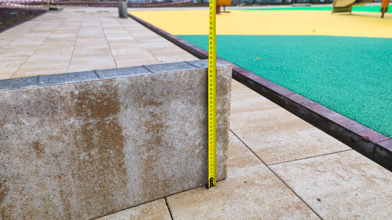 На фото показан бетонный бордюрный камень, установленный на плиточном покрытии, и рулетка, поставленная вертикально для измерения его высоты. На заднем плане заметна граница детской площадки с резиновым покрытием зелёного и жёлтого цветов, а также тротуарная дорожка и тёмный бордюр по кромке. Кадр передаёт процесс контроля параметров при благоустройстве двора: проверку высот, перепадов, толщины покрытия и аккуратности монтажа. Фотография пригодится для материалов о строительном контроле, ремонте дворов и технологиях укладки покрытий.