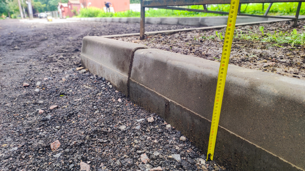 Измерение рулеткой высоты бордюра у щебёночного основания в дворовой зоне