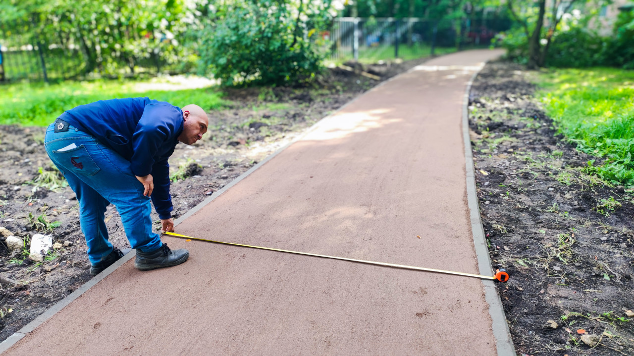 Рабочий измеряет ширину новой дорожки рулеткой на участке благоустройства
