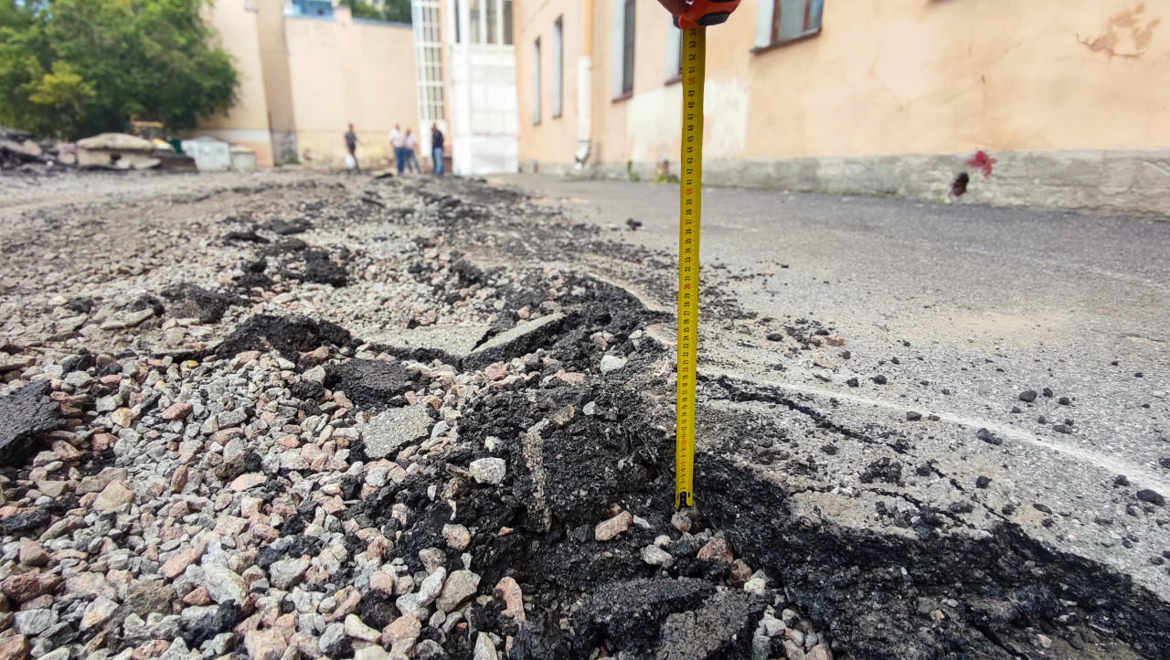 Измерение глубины щебёночной подушки среди обломков асфальта при ремонте покрытия