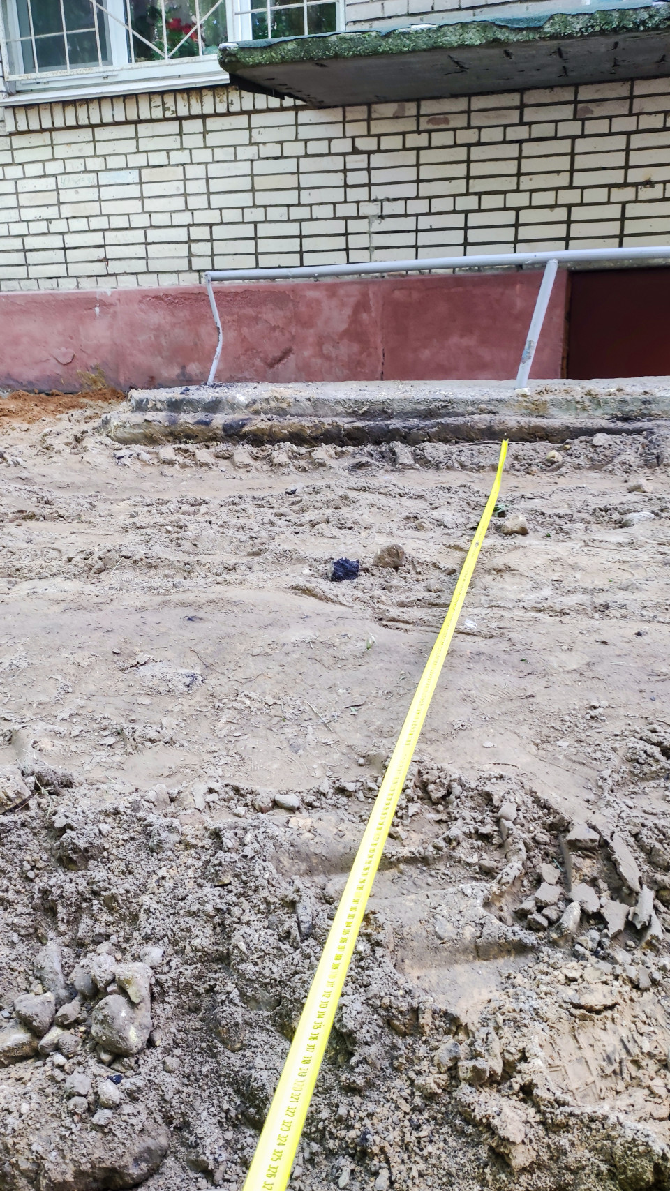 На переднем плане показан процесс измерения: жёлтая строительная рулетка протянута по песчаному основанию к ступеням входной группы у кирпичного фасада. В кадре видны крыльцо с поручнями, подвальная дверь, окно с решёткой и цоколь, а также неровная кромка старого покрытия рядом с подготовленной площадкой. Замер фиксирует расстояние и привязку элементов перед последующими работами по восстановлению проезда или тротуара. Съёмка выполнена на улице при дневном освещении в тёплый сезон. Фото подходит для материалов о строительном контроле, приёмке благоустройства и проверке геометрии при ремонте.
