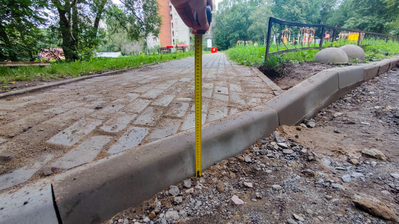 рулетка линейка измерение размеры сантиметры измерения измерительные работы обмеры замеры исследование качество контроль контроль качества проверка качества оценка качества экспертиза строительный контроль технический контроль технадзор строительный надзор технический надзор строительство благоустройство замер высоты бордюр бетон тротуарная плитка тротуар пешеходная дорожка щебень подсыпка кромка грунта подготовка основания ремонт тротуара установка бордюров городская среда двор ограждение спортивной площадки спортивная площадка газон деревья точность коммунальные работыПохожие фотографии
