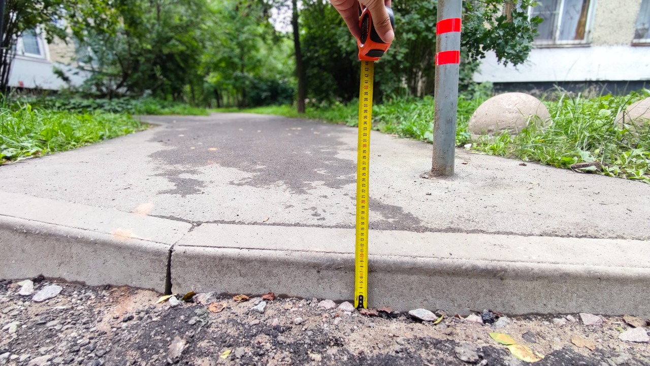 рулетка линейка измерение размеры сантиметры измерения измерительные работы обмеры замеры исследование качество контроль контроль качества проверка качества оценка качества экспертиза строительный контроль технический контроль технадзор строительный надзор технический надзор бордюр бордюрный камень тротуар пешеходная дорожка асфальт перепад высоты обследование благоустройство ремонт городская среда инфраструктура стык покрытия дорожные работы проверка нормативы уровень поверхности инженерные работы придомовая территория газон зелёные насаждения техника измерений фотофиксация крупный планПохожие фотографии