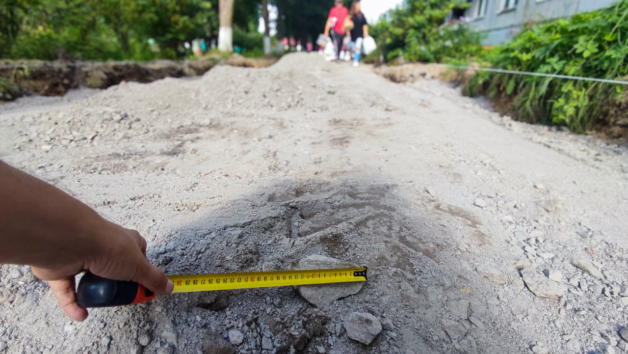 Рука удерживает рулетку при замере камня на щебёночном основании ремонтируемого дворового проезда