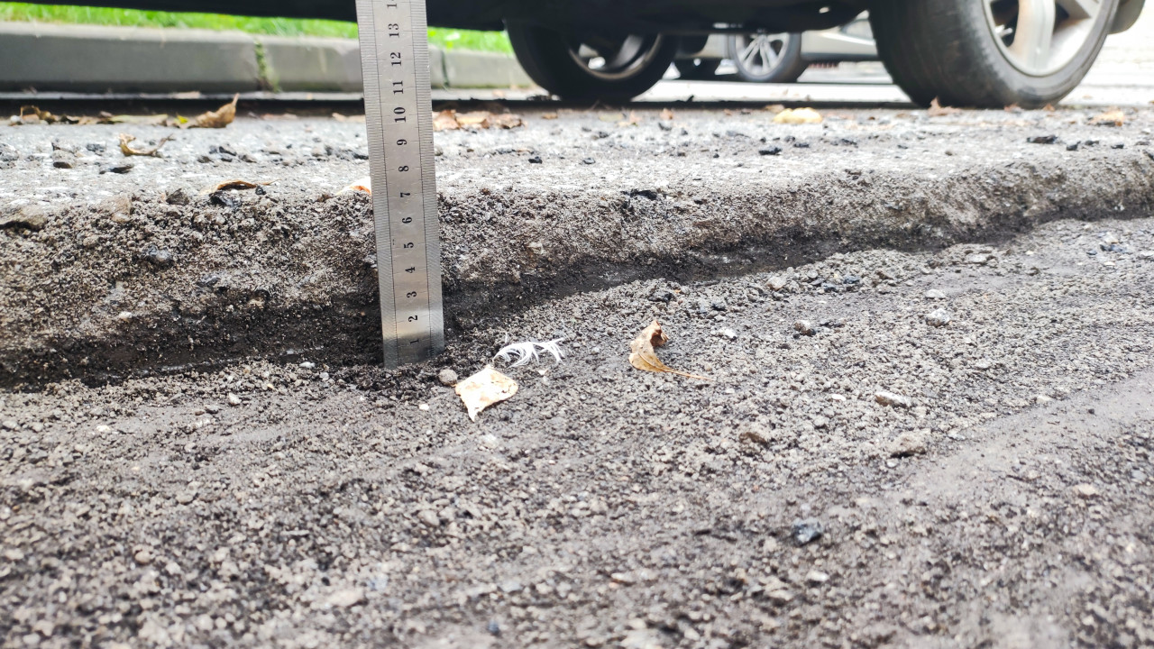 Линейка измеряет глубину колеи и выборки в асфальтовой крошке у бордюра рядом с колесом автомобиля