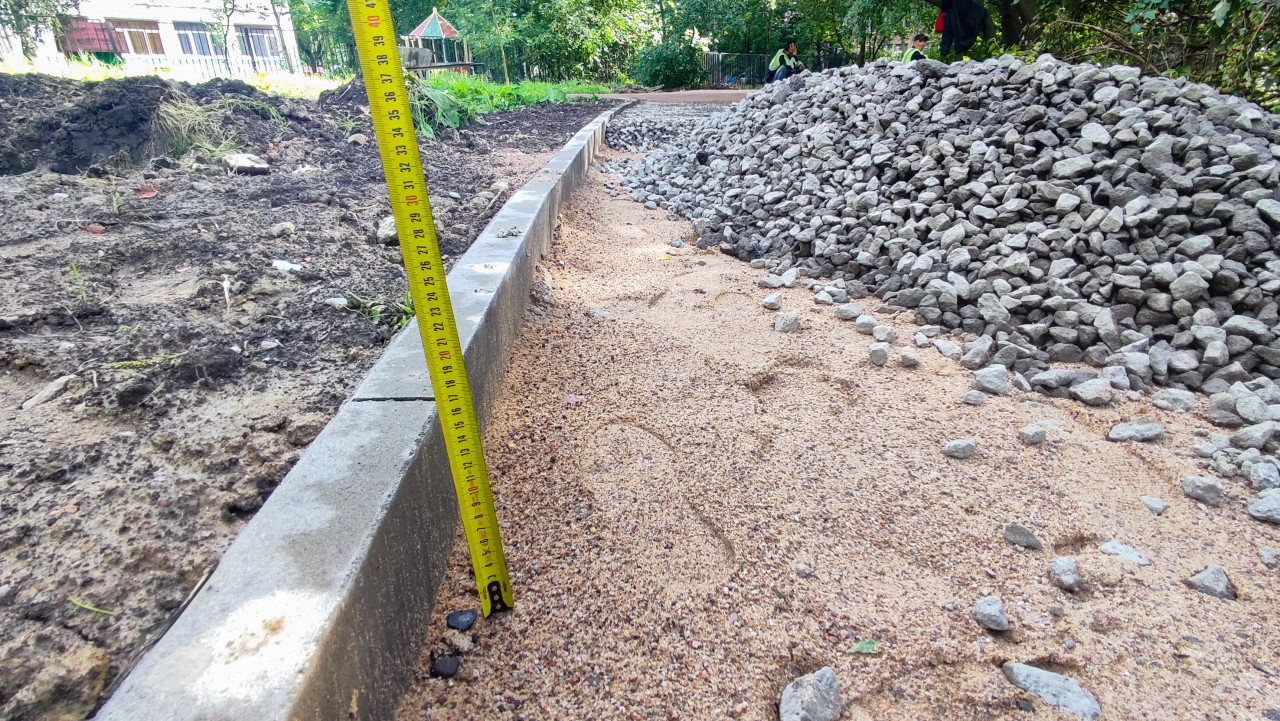 Снимок показывает участок благоустройства: вдоль нового бордюра засыпана ровная песчаная подушка, а справа лежит крупная куча серого щебня. В песок опущена измерительная рулетка, по которой видно толщину слоя; на поверхности заметны следы разравнивания и отдельные камни. Слева находится разрытая земля с комьями грунта и строительными фрагментами, на заднем плане видны деревья, кусты и силуэты людей, а также элементы площадки и фасад здания. Фото передаёт процесс подготовки основания под покрытие. Подходит для материалов о ремонте дворов, контроле качества и технологиях укладки.